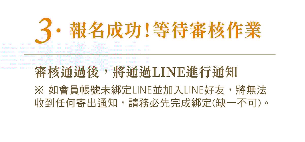 ※ 提醒:如未綁定LINE會員並且加入LINE好友,將無法收到任何審核成功、寄出通知,請務必先完成綁定! (缺一不可)