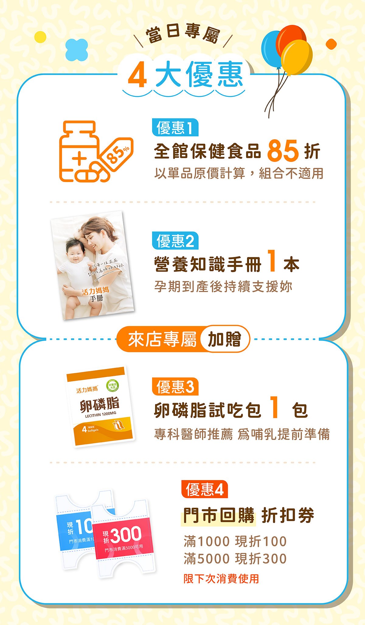 - 當日必須攜帶「媽媽手冊+媽媽本人證件」,由門市人員審核資格後蓋章。