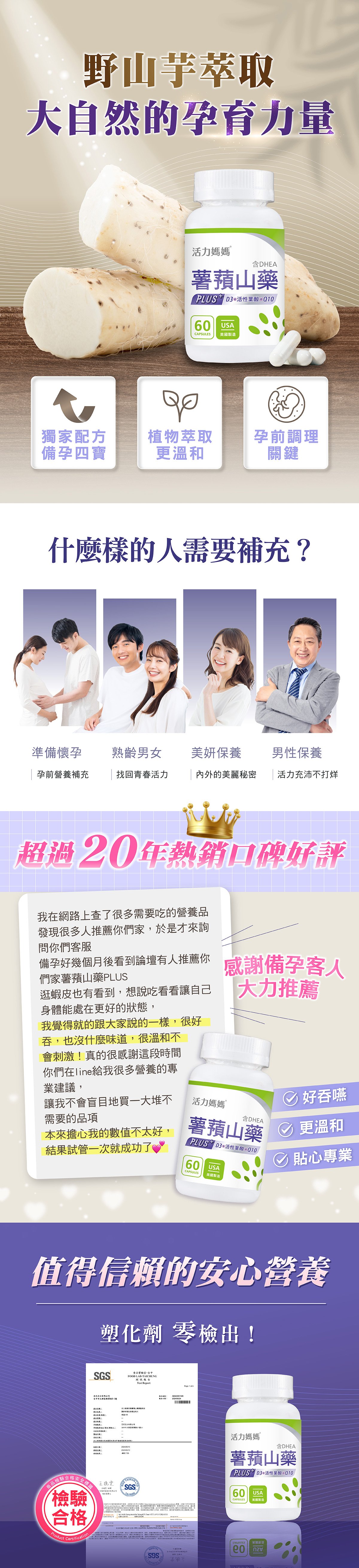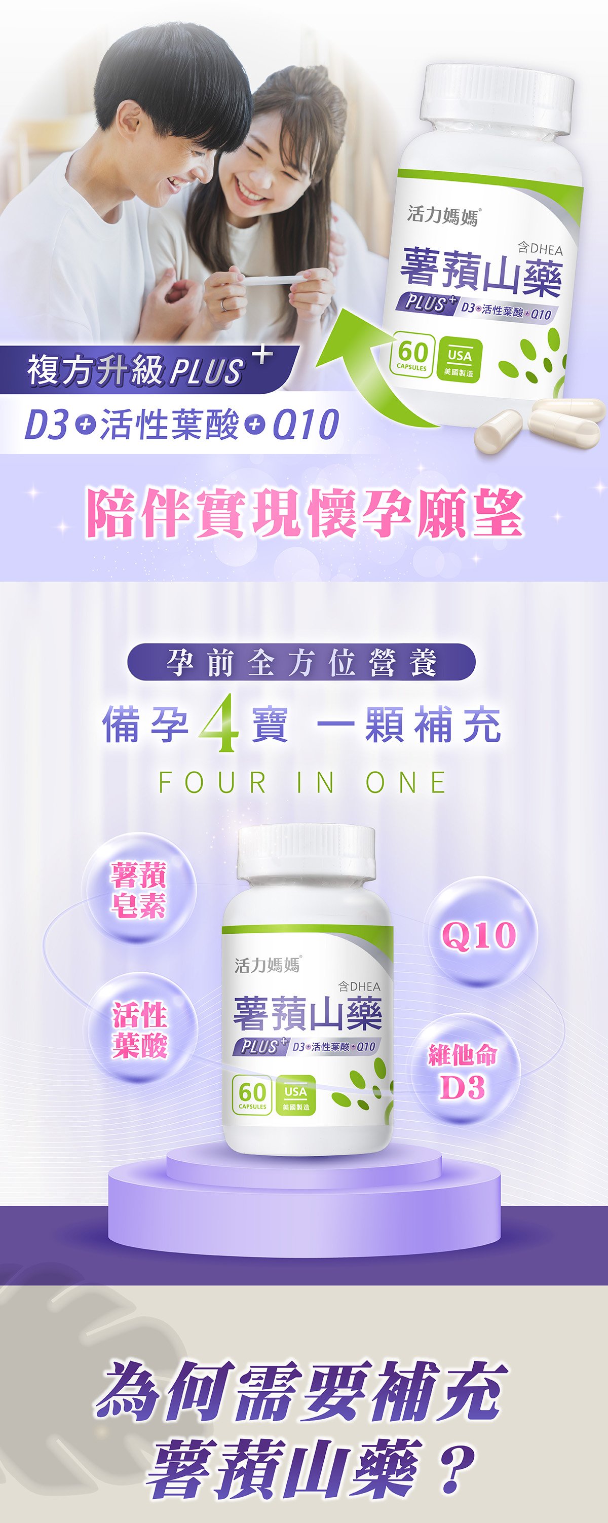 倍韻薯蕷山藥膠囊PLUS成分升級,添加獨家複方d3、q10、活性葉酸,提供更全面備孕營養素。