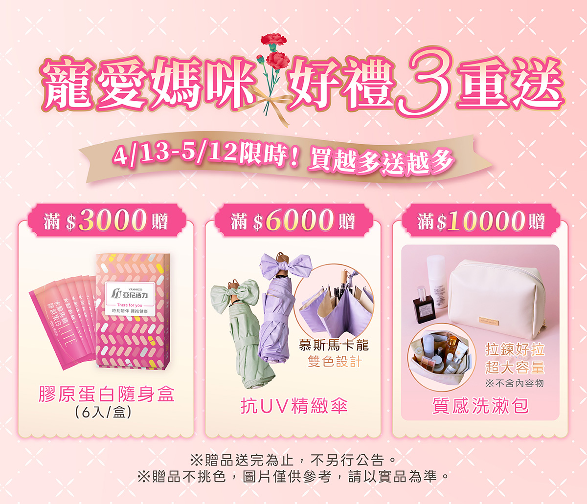 ※ 贈品不挑款/顏色,圖片僅供參考,請以實品為準。※ 活動限單筆訂單計算,各門檻贈品限送1份,無累贈。※ 數量有限送完為止,恕不另行公告。※ 加購商品及運費不列入滿額禮計算範圍。