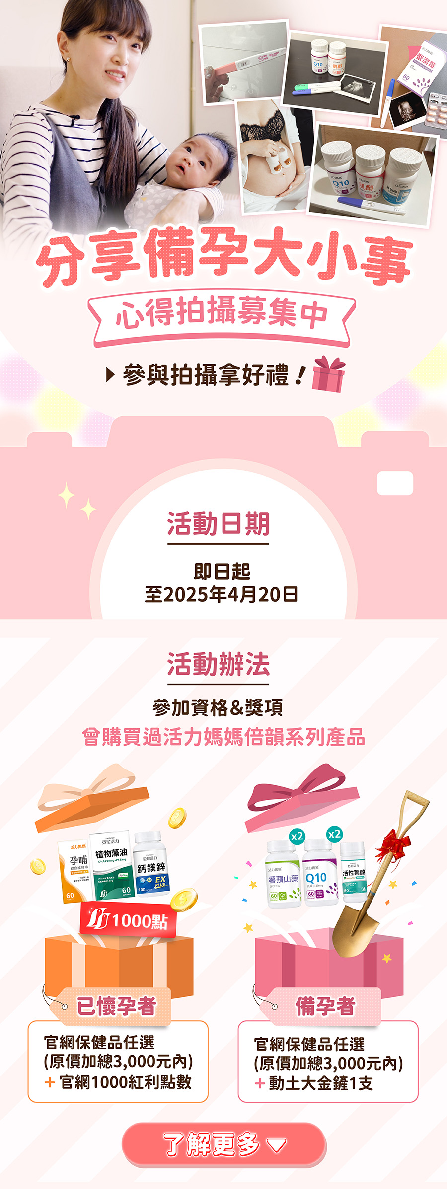 【2025活力媽媽倍韻】備孕心得拍攝募集中!參加分享拿好禮 2025-02-18 優惠活動 【注意事項】 每人限報名一次,重複報名者恕不受理。 報名者請務必在表單內填寫完整姓名及資訊。 填寫第一階段問券為初選,入選者會另行通知。 本站遵守隱私政策之規範,未經授權,不對外揭露任何客戶資料。 凡參加本活動者,其所發表之內容,亞尼活力有限公司有權摘錄內容作為宣傳-或廣告刊登並無償使用。 活動因故無法進行時,亞尼活力有權修改、取消、暫停、終止本活動。 亞尼活力有限公司保留解釋活動之權利。 回總覽