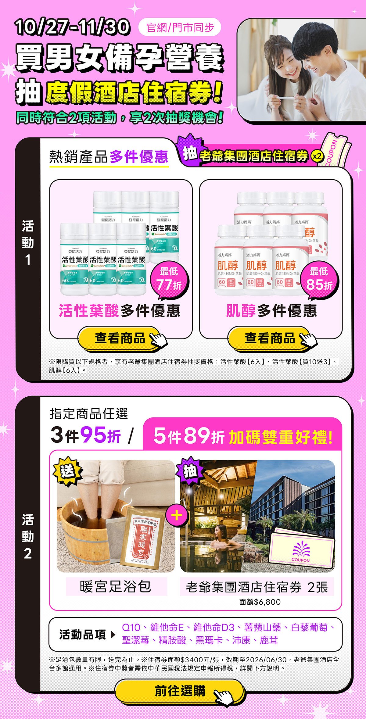 【男女備孕營養,抽度假酒店住宿券】10/27-11/30