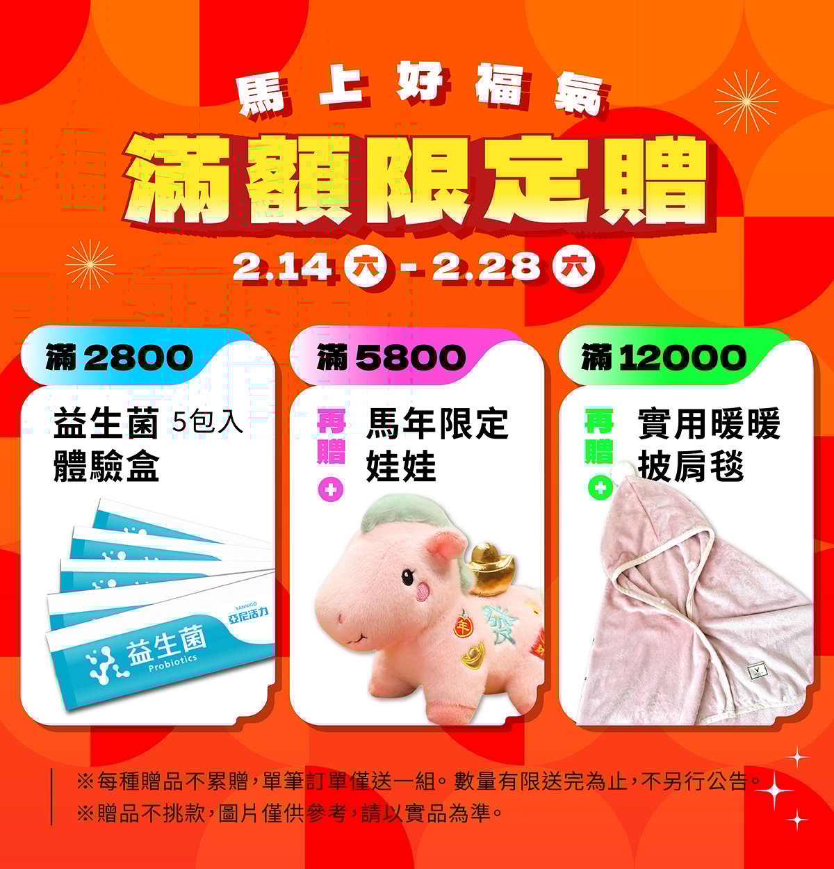 ※ 活動限單筆訂單計算,各門檻贈品限送1份,無累贈。