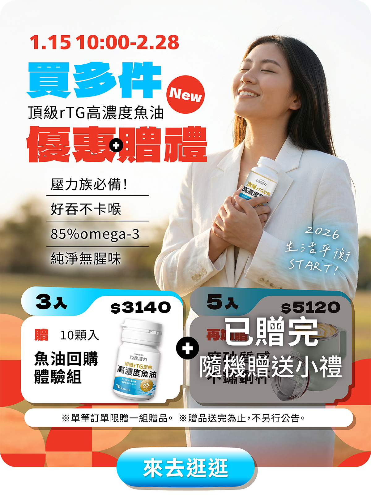 ※ 魚油三入、五入贈品可累贈,單筆訂單限贈一組贈品。※ 買三入贈「魚油回購體驗組」*1,五入贈「魚油回購體驗組」*1+「磨砂質感不銹鋼杯」*1。※ 贈品送完為止,不另行公告。