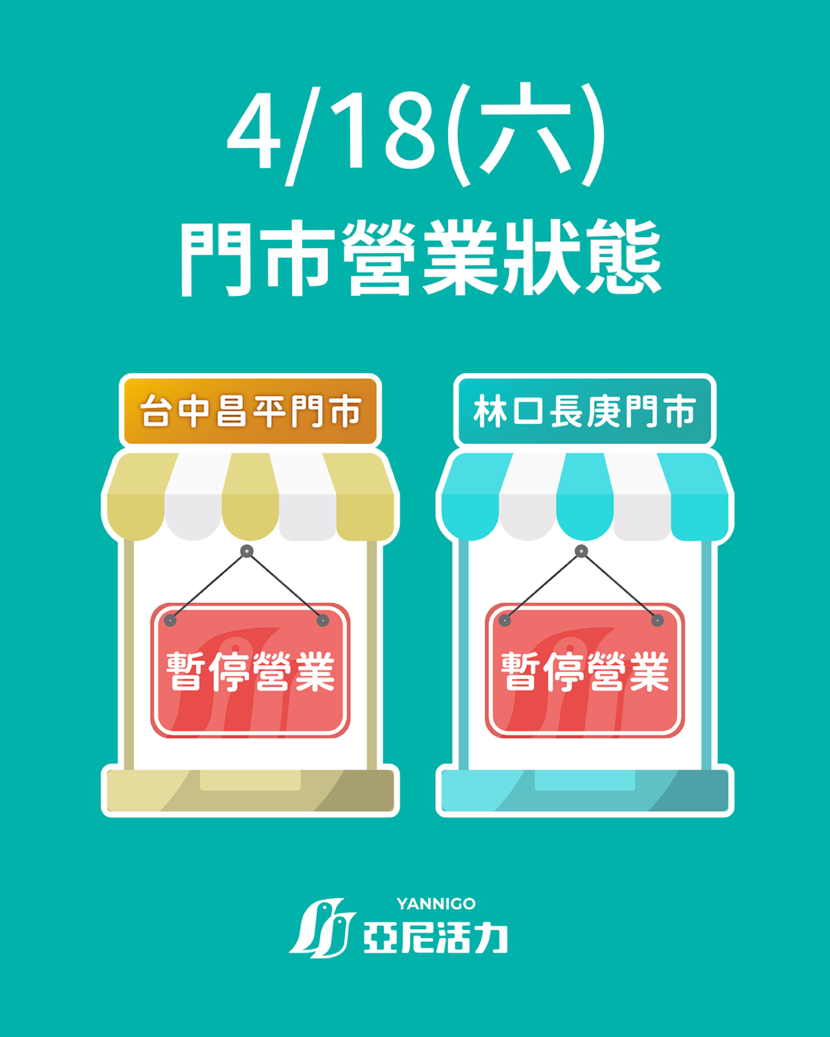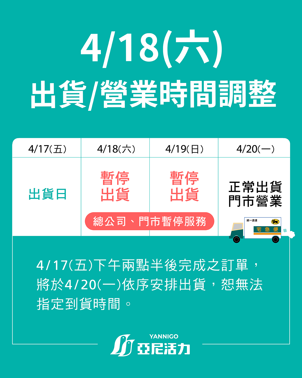 【公告】4/18 教育訓練 | 出貨/門市營業時間調整公告 2026-04-10 重要公告 【營運時間異動公告】 因應總公司內部教育訓練, 亞尼活力總公司及門市暫停服務,並調整出貨日程 服務時間調整如下: 4/18 (六):門市公休、暫停出貨。 4/20 (一):恢復正常營業與出貨作業。 回總覽