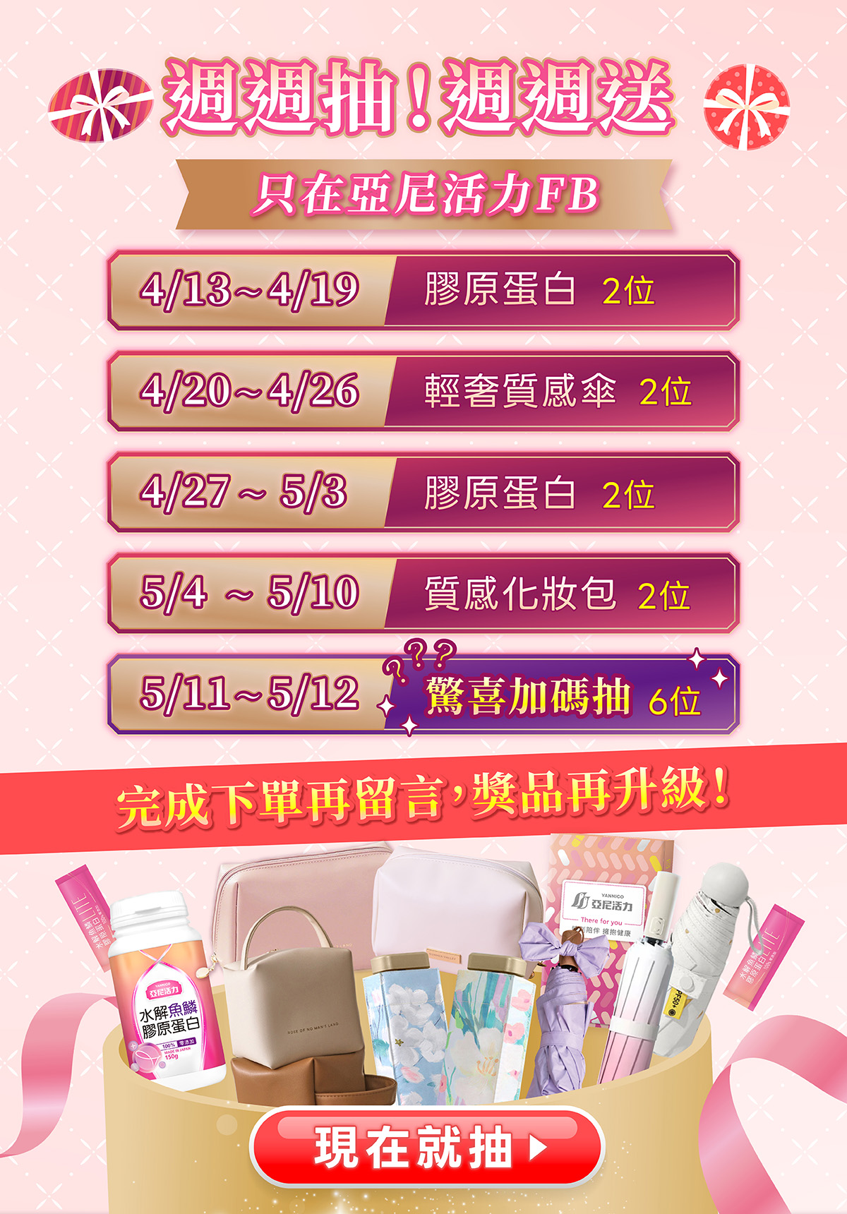 ---抽獎時程---‧04/13-04/19膠原蛋白|2位‧04/20-04/26輕奢質感傘|2位‧04/27-05/03膠原蛋白|2位‧05/04-05/10質感化妝包|2位‧05/11-05/12 驚喜加碼抽|6位