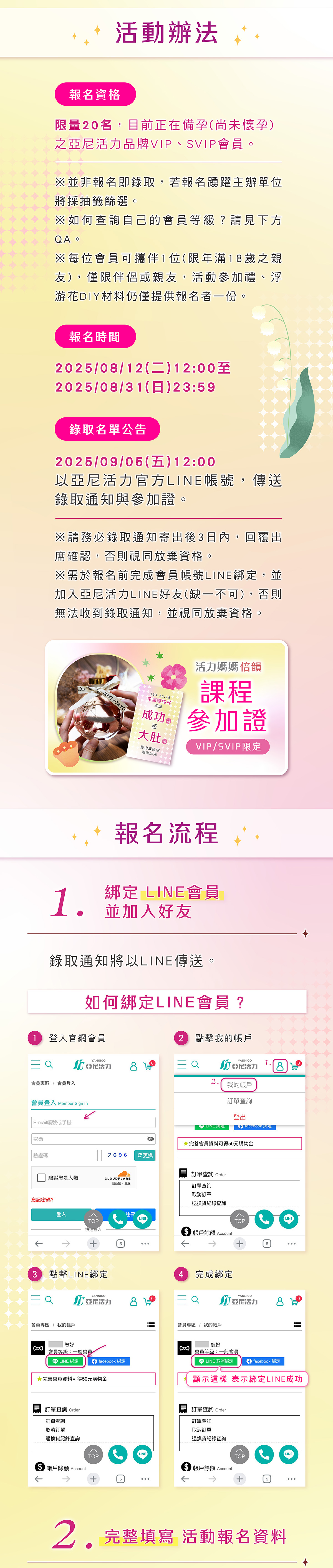 ※報名時請完整填寫姓名、電話,並完成會員帳號LINE綁定並加入亞尼活力LINE好友。