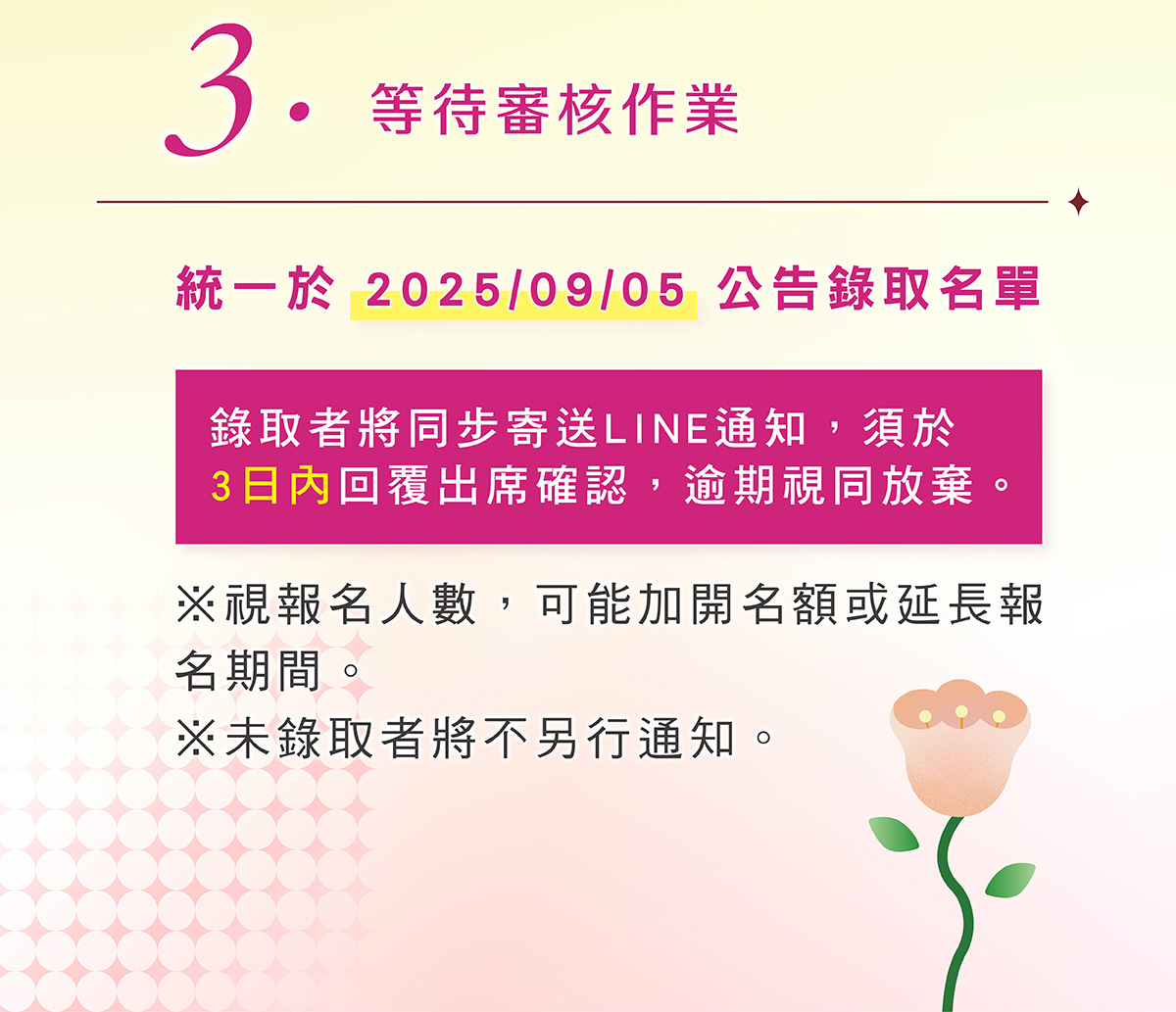 若成功錄取,將在9/5以亞尼活力官方LINE帳號傳送錄取通知,請務必在3日內回覆出席確認,否則視同放棄資格。