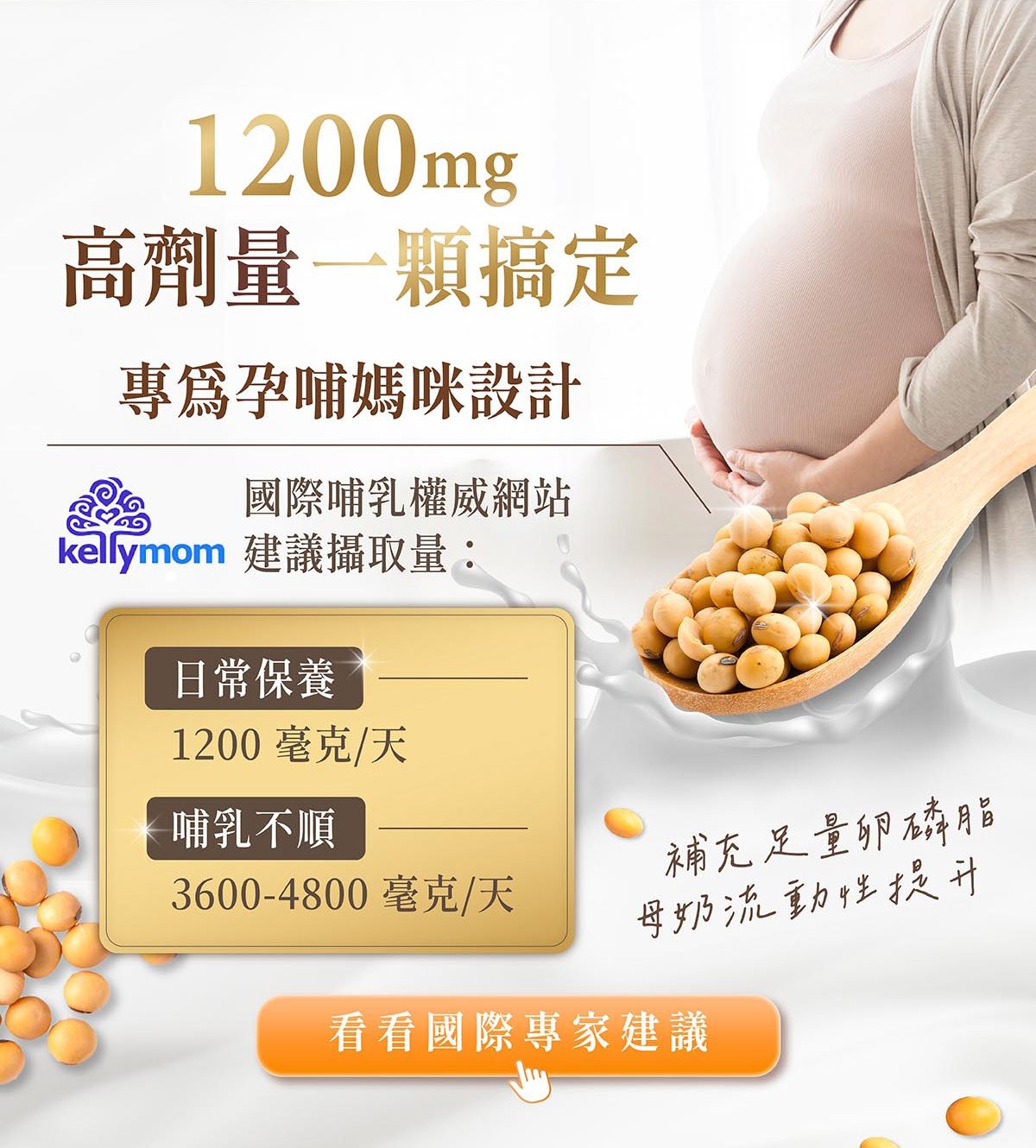 孕婦補充足夠的卵磷脂是很重要的,懷孕22週(約4個月)開始,卵磷脂補充劑量,一天一顆1,200mg活力媽媽卵磷脂,並持續至哺乳期與退奶階段,幫助媽咪和寶寶維持健康狀態。