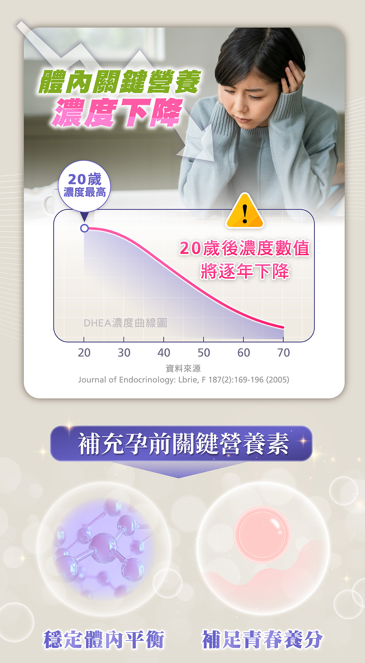 DHEA是一種天然存在於男性及女性體內的賀爾蒙,作為雌激素和睾固酮的前驅物,對生育能力有重要影響。隨著年齡增長,體內的DHEA含量會隨之下降。