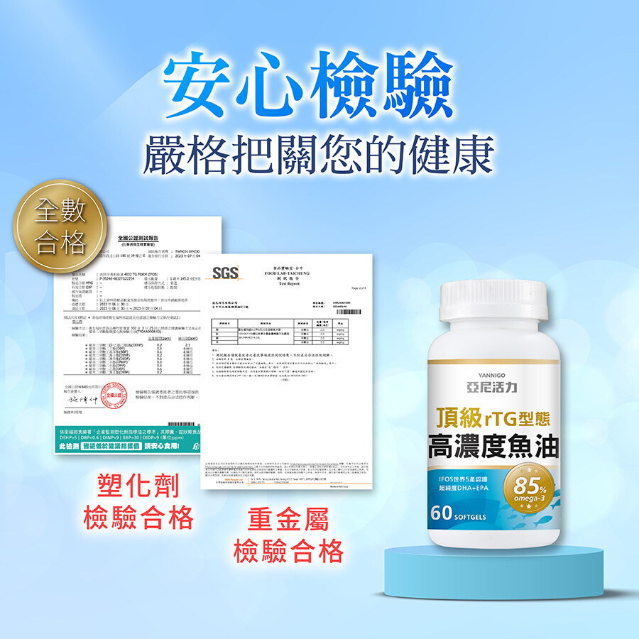 亞尼活力的高濃度魚油是選用高濃度、高吸收率、新鮮度高、無汙染的rTG型式魚油;無汙染海洋小型魚,避免重金屬汙染;選擇專利製程:西班牙Solutex大廠通過IFOS五星級認證;擁有超臨界萃取技術,每批皆送檢才上架,確保品質,讓您輕鬆攝取足量Omega-3。