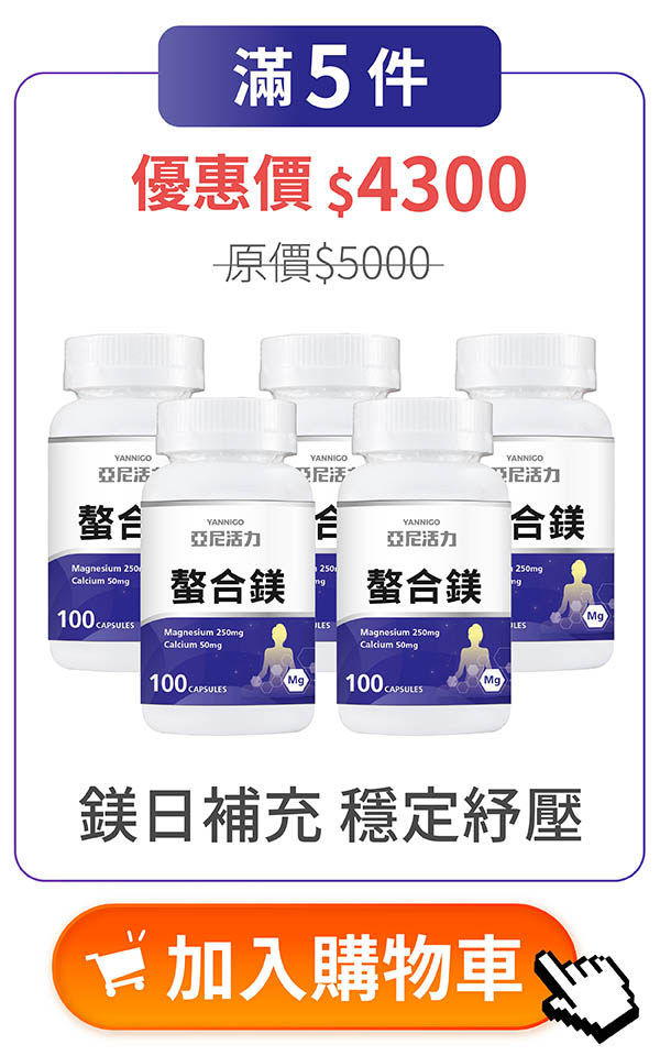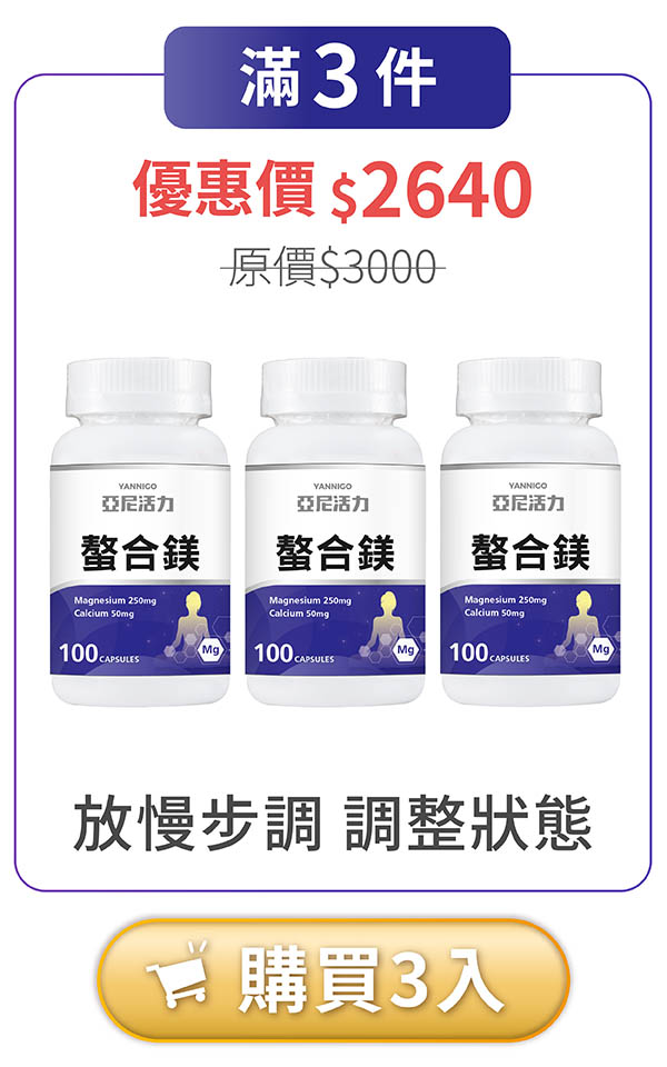 根據衛福部國民健康署建議,成人每日鎂的攝取量為男性 380 mg、女性 320mg,每日總攝取不超過 700mg。亞尼活力螯合鎂每粒含有 250 mg純鎂,建議於每日飯後或睡前補充 1-2 粒即可,一日請勿超過2粒,多食無益。